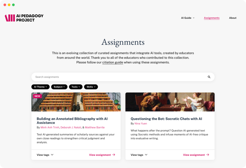 A curated repository of classroom-ready assignments from educators around the world. Some directly incorporate AI tools, while others help students consider responsible AI use.